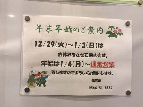 「ロードサービス」 明日12/29から1/3まで 年末年始のお休みを頂きます お車のパンクやバッテリー上がり など急なトラブルがあった時は、 まずご自身の任意保険に ロードサービスが付いてないかご確認ください JAFのようなサービスを受けれる可能性があります 年末年始、大雪も予想されています。 不要不急の外出は控えた方が無難かもしれませんね岡崎市で車検整備ならホリデー車検くるまの元気屋