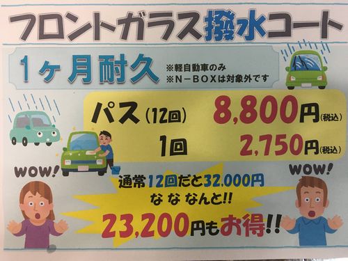 年間パスポートもありまして、12回ガラス撥水コートが付いています。年間パスは8800円で提供しています。