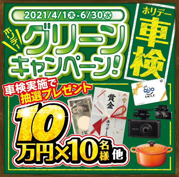 お知らせホリデーグリーンキャンペーンのご案内 当店で車検を受けて、応募用紙を 記入していただくと、抽選でプレゼントが当たる キャンペーンを行っています!